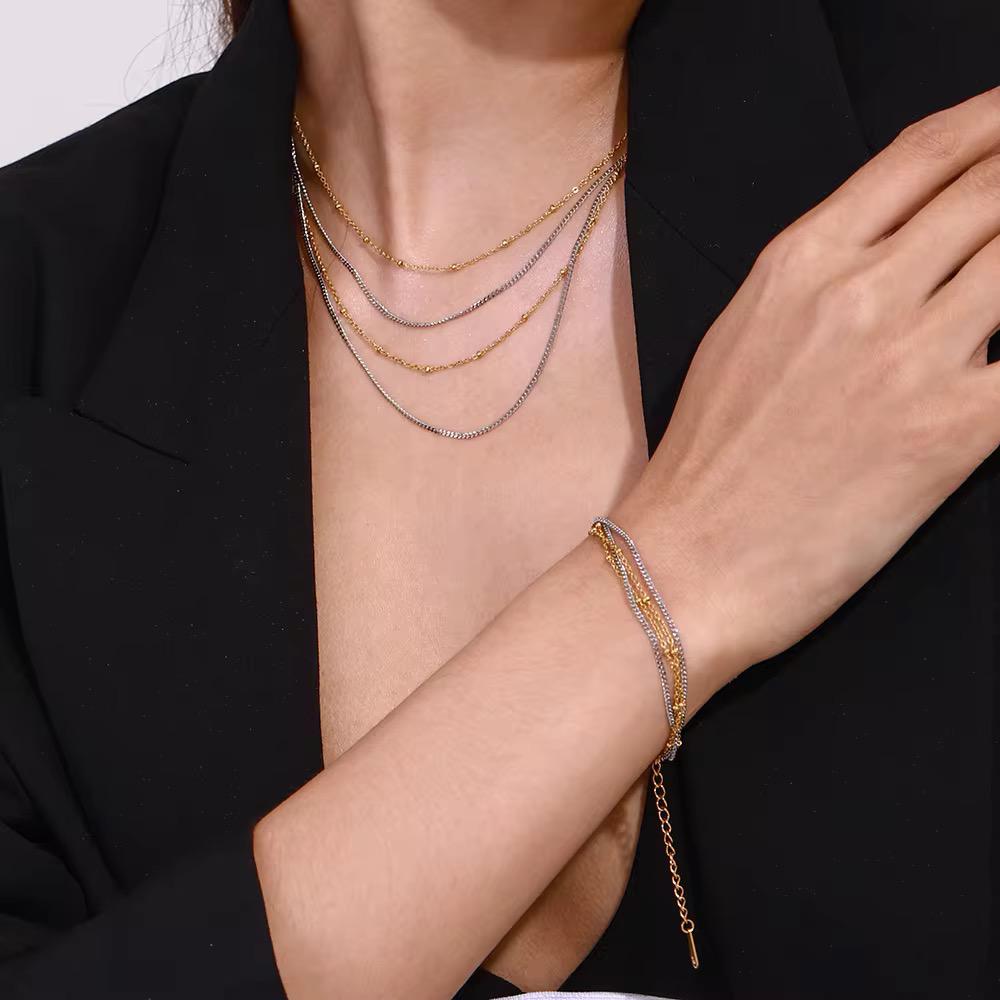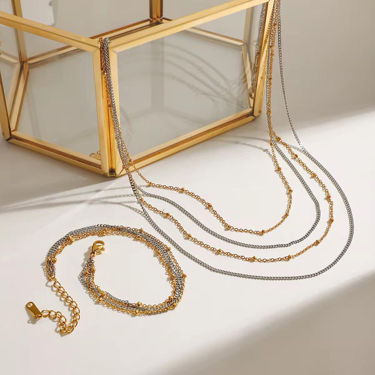 | Style | Layered beaded chains in mixed gold and silver tones, includes necklaces and a bracelet |