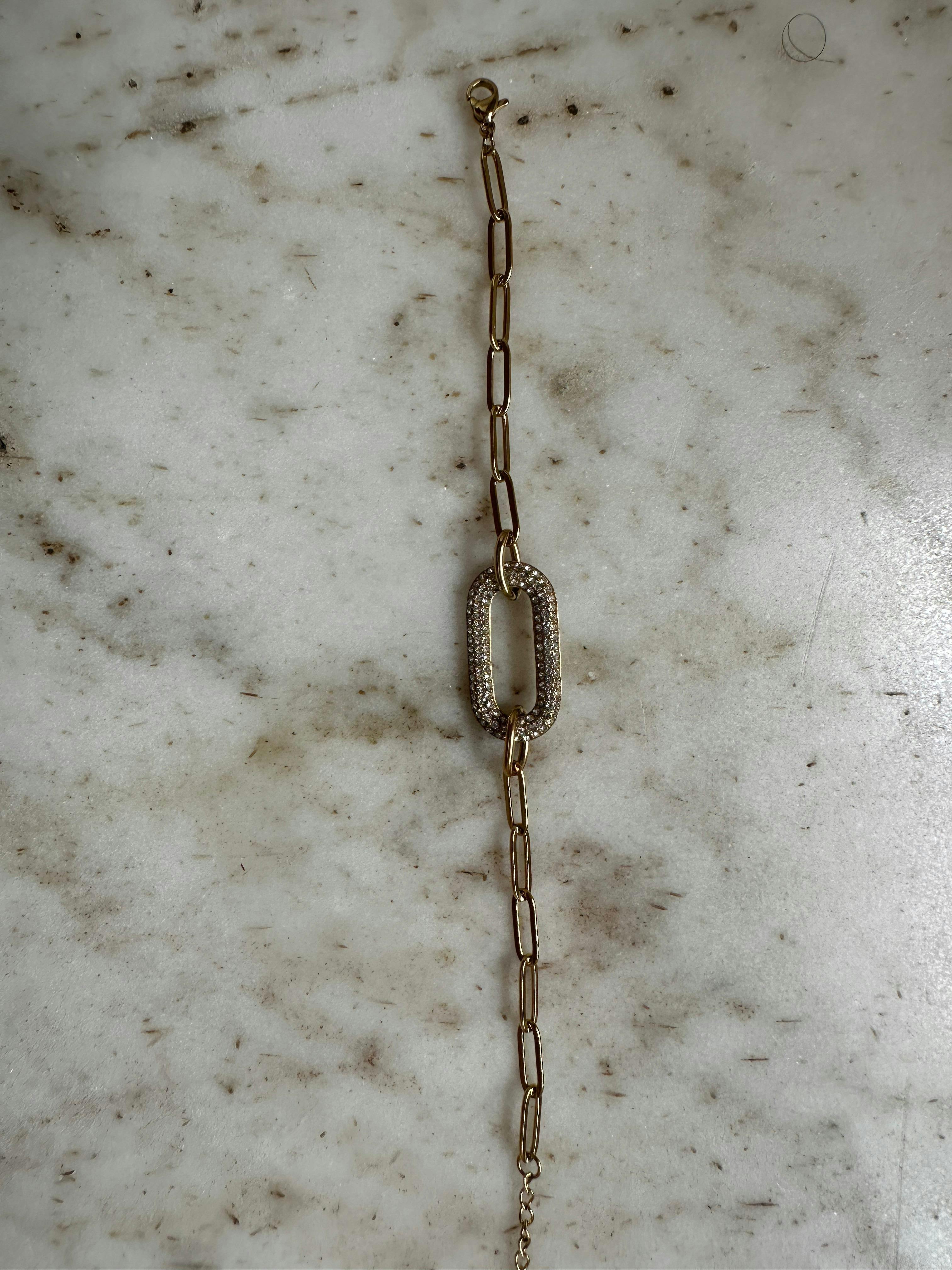 The ultimate fusion of modern edge and timeless glamour. The Sloane Bracelet features a chic, oversized paperclip chain centered by a dazzling, triple-row pave link that sparkles from every angle. It's the perfect statement piece to elevate your wrist stack or wear solo for a touch of everyday luxury.