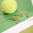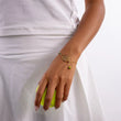 Serve up a winning look with the Faye Grand Slam Bracelet, an exclusive piece for the tennis enthusiast. This unique bracelet features a miniature tennis racket pendant, meticulously detailed with a tiny grip accented with a green and white stripe. The charm is paired with a vibrant green bead that captures the energy of a tennis ball. Suspended from a dainty gold chain, this 18kt gold plated bracelet is the perfect way to carry your passion for the game wherever you go.