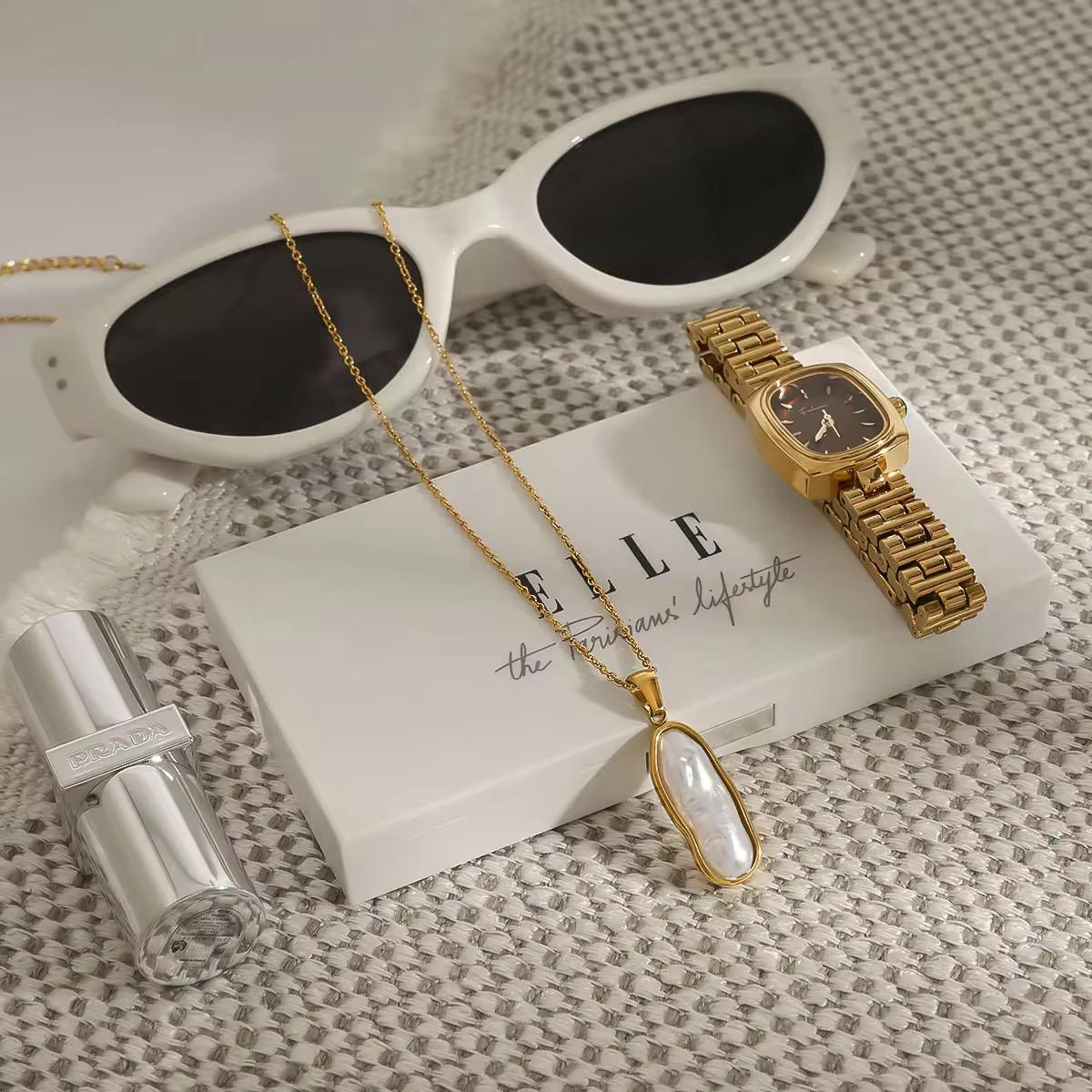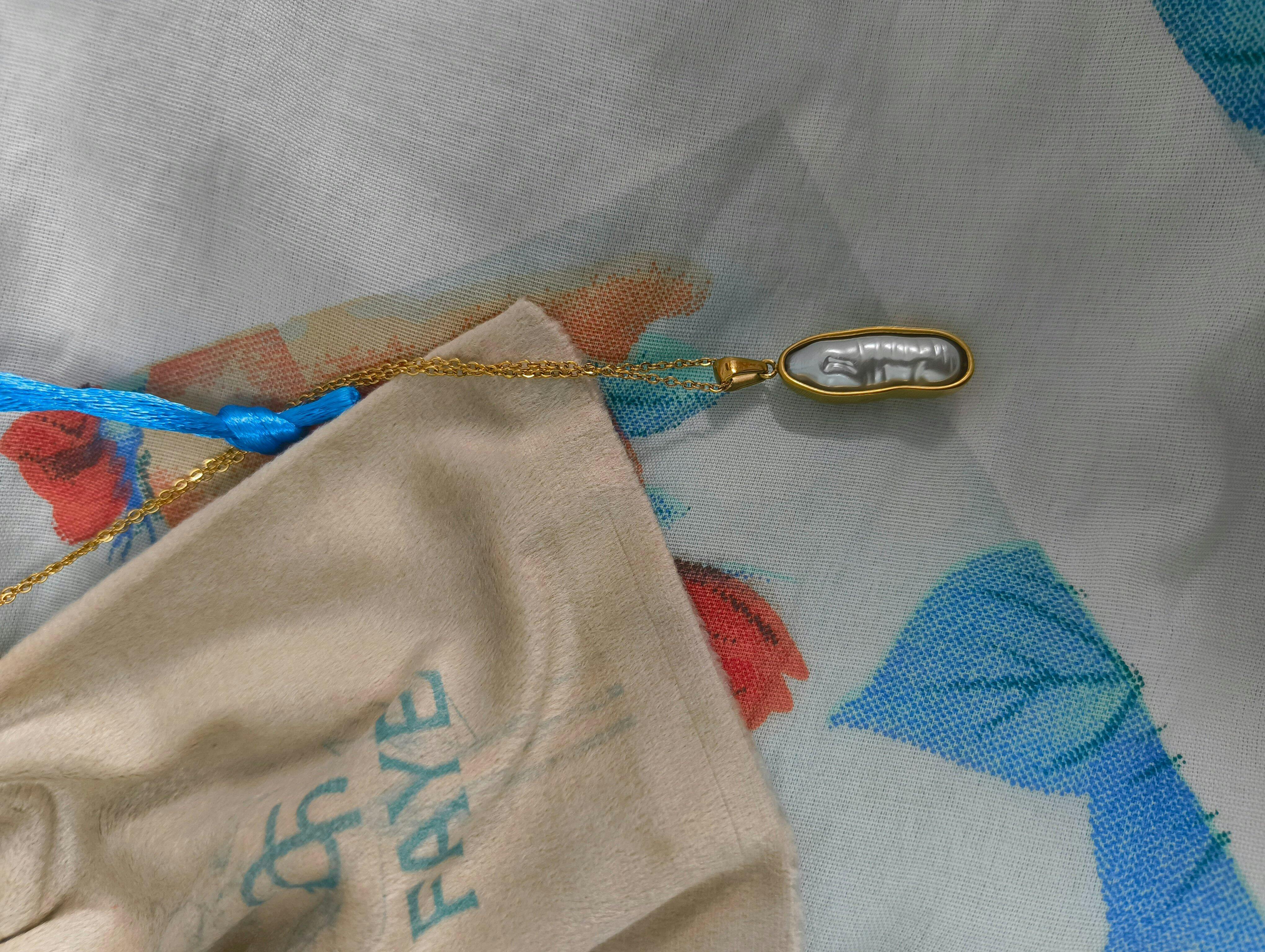 | Style | Delicate gold chain with an oval-shaped pendant encasing a smooth white stone |
